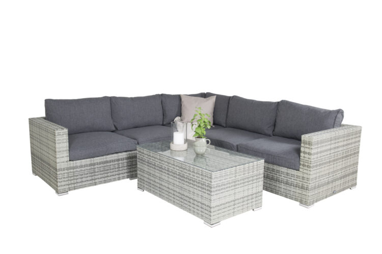 Soffgrupp i modern design med fokus på en god komfort till din uteplats eller altan. Soffgruppen består av en hörnsoffa i modulform med fyra sittplatser och en hörndel som går lätt att bygga ihop för att passa dina behov. Inklusive mörkgrå mjuka dynor samt ett lägre soffbord med en bordsskiva av glas. Tillverkat av en metallstomme och grå konstrotting.