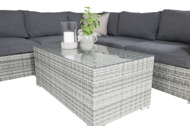 Soffgrupp i modern design med fokus på en god komfort till din uteplats eller altan. Soffgruppen består av en hörnsoffa i modulform med fyra sittplatser och en hörndel som går lätt att bygga ihop för att passa dina behov. Inklusive mörkgrå mjuka dynor samt ett lägre soffbord med en bordsskiva av glas. Tillverkat av en metallstomme och grå konstrotting.