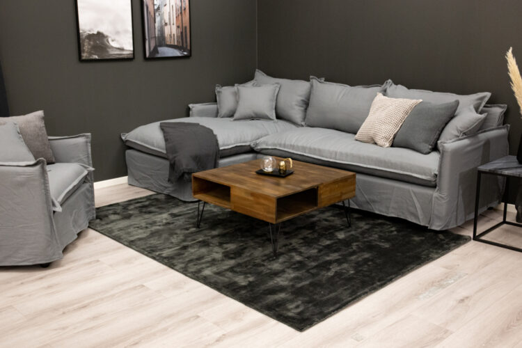 Fyrkantigt soffbord i vacker teak och med praktisk förvaring som är delvis skymd i bordet.