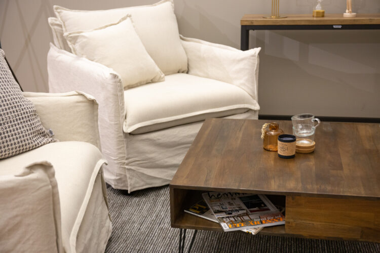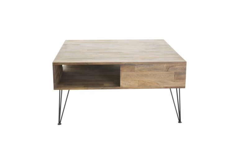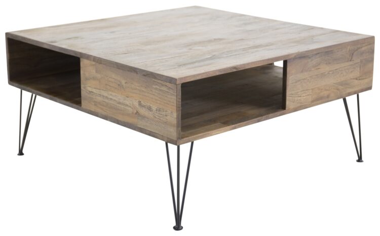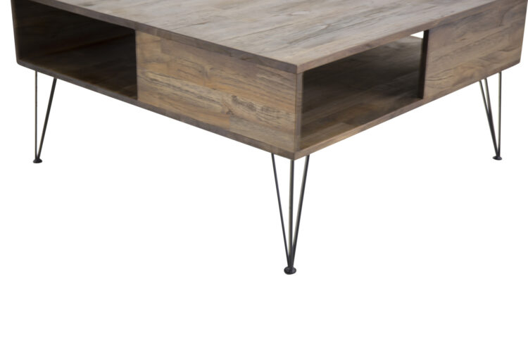 Fyrkantigt soffbord i vacker teak och med praktisk förvaring som är delvis skymd i bordet.