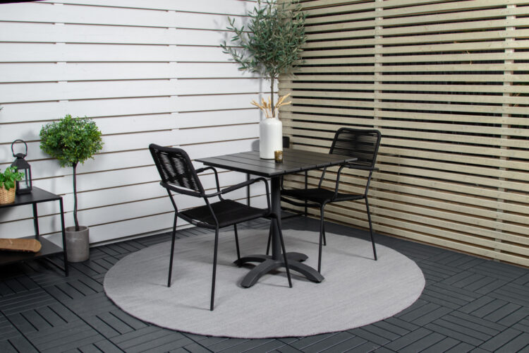 En liten, nätt och modern matgrupp i elegant svart kulör som passar perfekt på balkongen eller altanen! Kombinationen av matbordet Colorado och de trendiga stolarna Lindos ger ett ombonat och lyxigt uttryck på vilken uteplats som helst! Möblerna är tillverkade av slitstarka material, om du följer våra skötselråd får du en smidig matgrupp som håller länge.