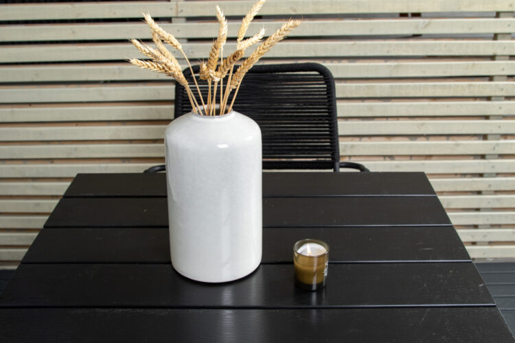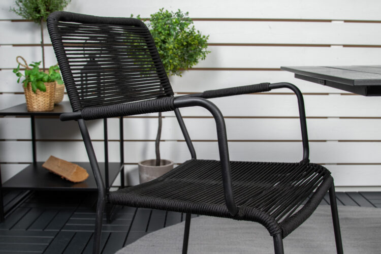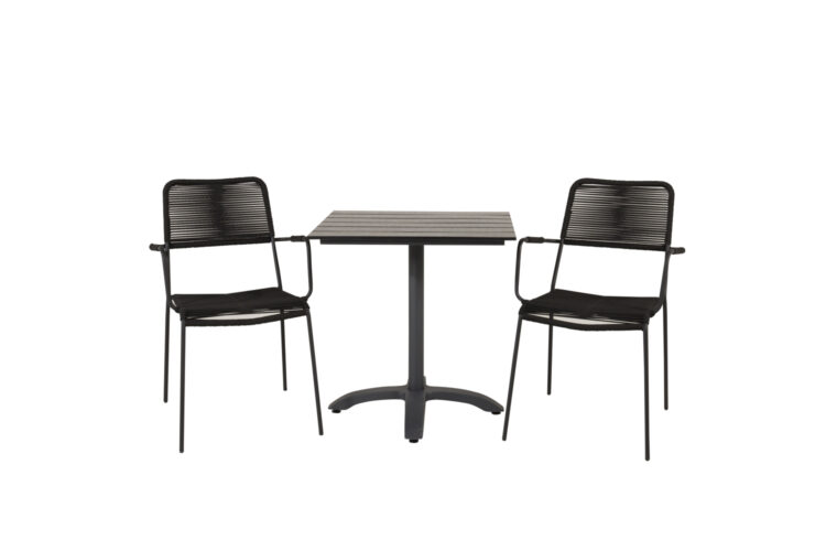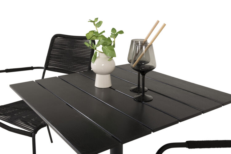 En liten, nätt och modern matgrupp i elegant svart kulör som passar perfekt på balkongen eller altanen! Kombinationen av matbordet Colorado och de trendiga stolarna Lindos ger ett ombonat och lyxigt uttryck på vilken uteplats som helst! Möblerna är tillverkade av slitstarka material, om du följer våra skötselråd får du en smidig matgrupp som håller länge.