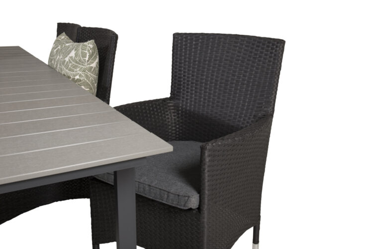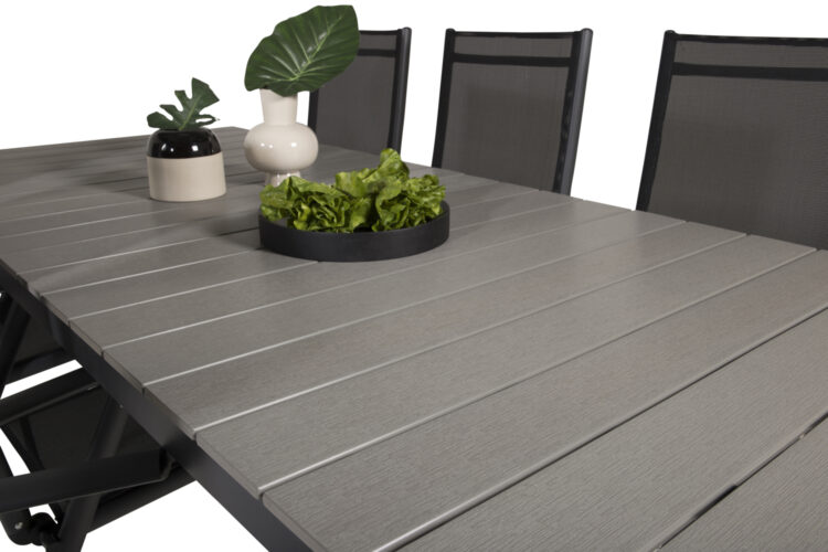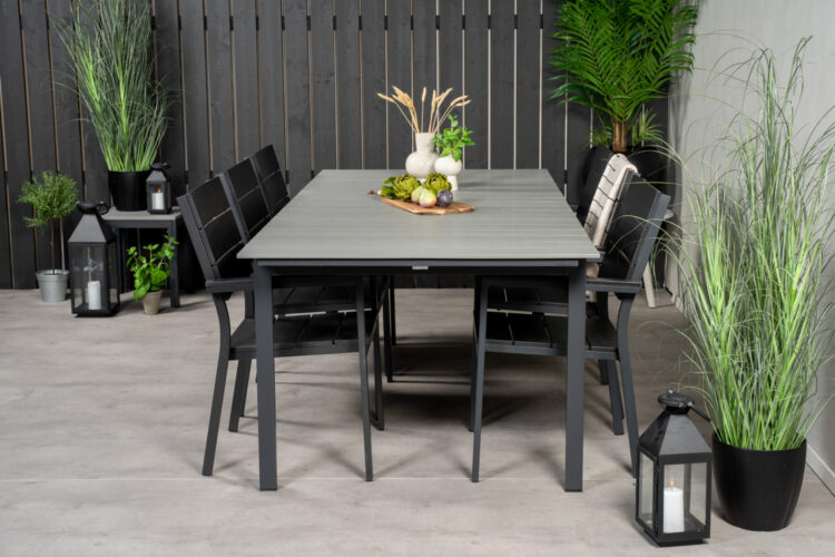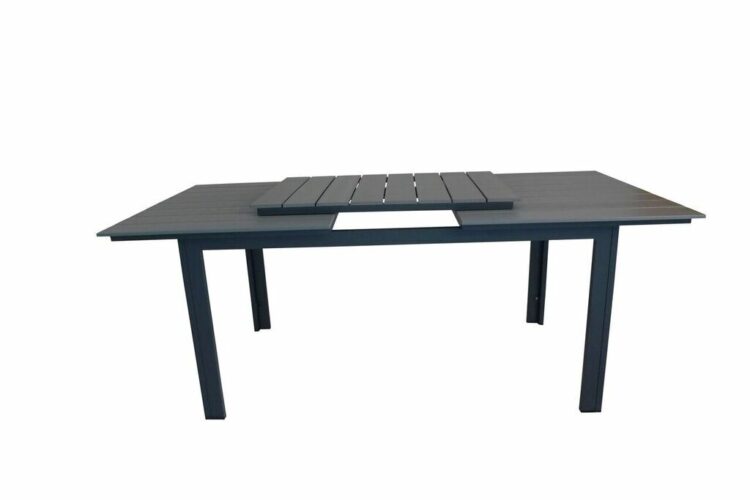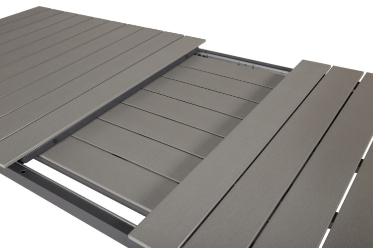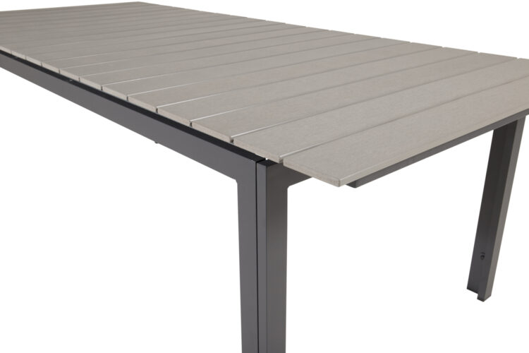 Levels – Ett rektangulärt matbord som går att förlänga vid behov när det behövs fler sittplatser: här får alla nära och kära plats! Bordsskivan är i grå aintwood och bordsbenen i svart metall: två slitstarka material som ger dig ett tåligt matbord för utomhusbruk. Möblera tillsammans med ett par bekväma matstolar så får du en komplett matgrupp till sommarens utomhusmåltider.