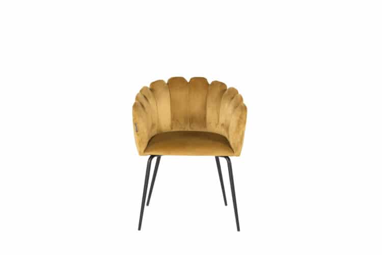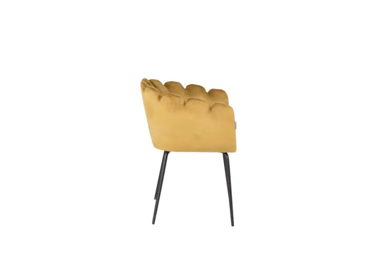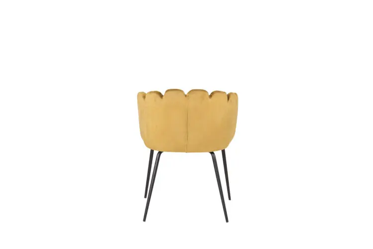 En modern färgklick kan enkelt lyfta inredningen till nästa nivå! Limhamn matstol är en modern favorit i många hushåll. Den har en inbjudande design med dekorativ snäckformad rygg med dekorsömmar och en rund sits i gult sammetstyg. Benen är i svart pulverlackerad metall. Skapa ett trivsamt blickfång i hemmets hjärta! Lättare montering krävs.