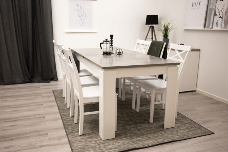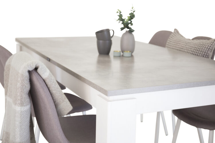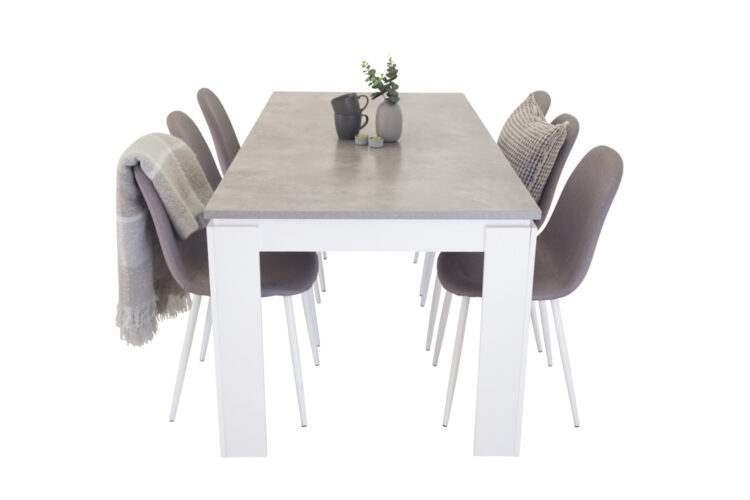 Lind, vårt robusta rektangulära matbord i skandinavisk design som passar perfekt både till vardag och fest. Bordsskivan har en smäcker cement-look och de vita bordsbenen ger ett stadigt intryck. Skapa en elegant tyngd i hemmets hjärta med ett matbord som står sig över tid och bjud in till många sociala stunder framöver.