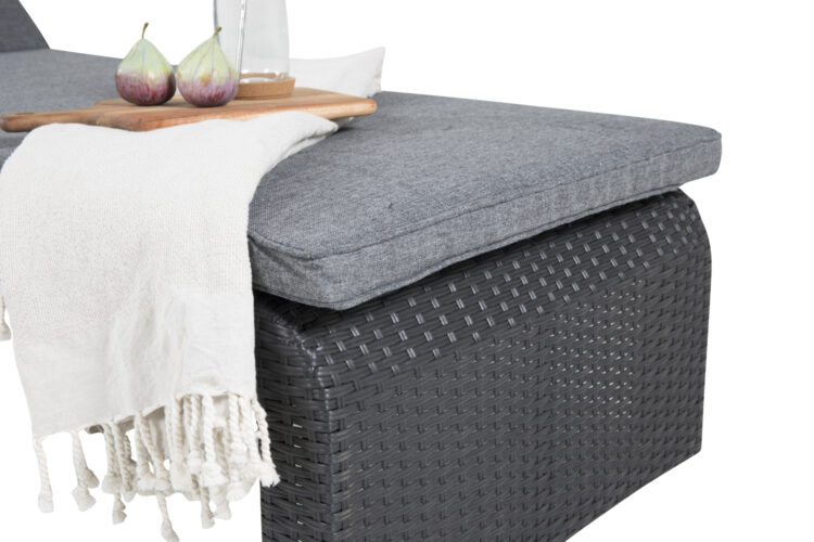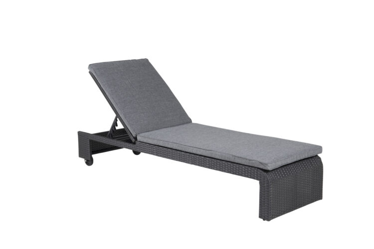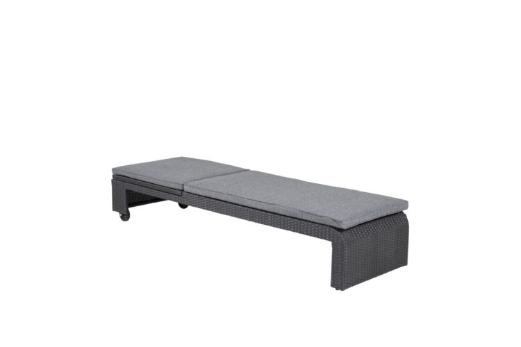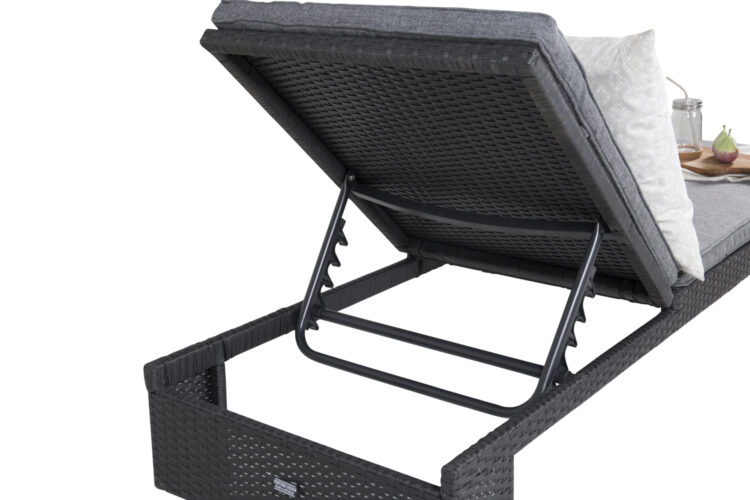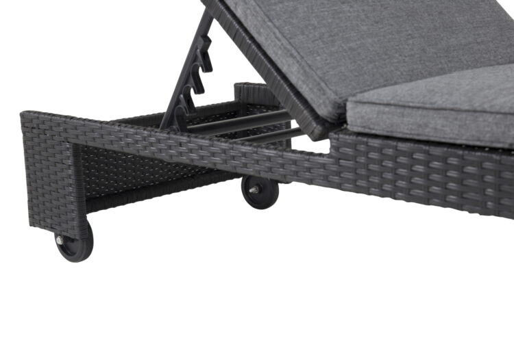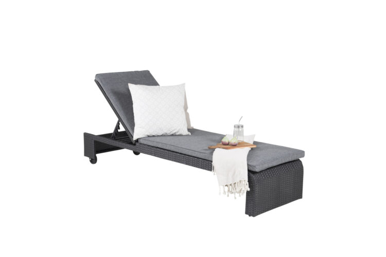London solsäng i en stilren och pampig design skapar ett trivsamt blickfång på din uteplats. Här får du en svart solsäng med grå dyna, hjul och justerbart ryggstöd för optimala vilopositionen. Solsängen är tillverkad av svart konstrotting vilket gör den slitstark i utomhusmiljö. Robust, stabil och bekväm – här kan du njuta länge av lediga stunder på sommarens soliga dagar.