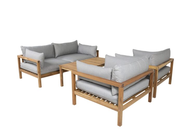 Modernt och ombonat! Marion ger dig en soffgrupp att längta hem till en varm sommarkväll. Soffgruppen har två sköna stilrena breda fåtöljer och en bred tvåsitssoffa, perfekt för den inglasade uteplatsen med en stomme av akacia med tjocka ljusgrå dynor med god sittkomfort – här sitter du gärna kvar länge och njuter av sommarens härliga stunder!