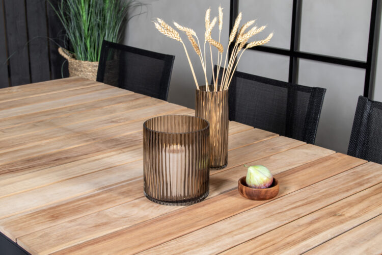 Våra möbler i textilene kombineras vanligtvis med teak eller aluminium. Textilene är ett syntetiskt tyg som är tillverkat av PVC-behandlad polyester. Materialet är vattenresistent och UV-behandlat för att motverka solens blekning.