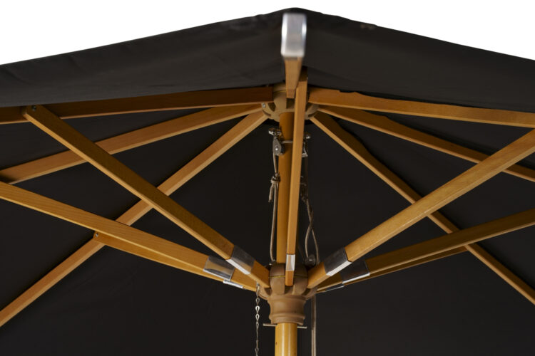 Ett något bredare och högre parasoll i svart, smakfullt och fristående med en stomme i trä.