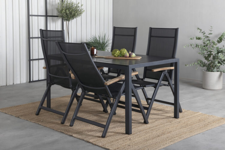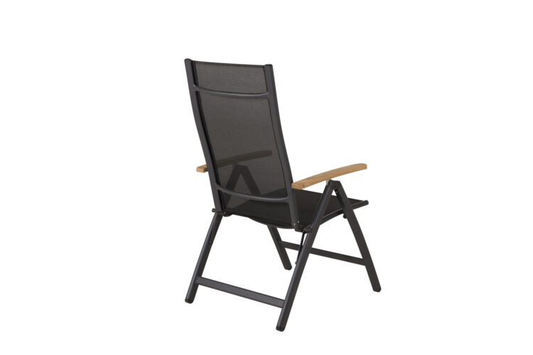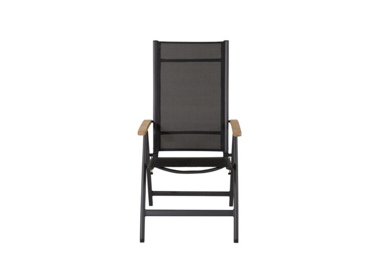 Panama, en svart fällbar matstol anpassad för utomhusbruk. Med smakfulla armstöd i teak får stolen ett pampigt uttryck, vilket faller många i smaken. Stolen funkar lika bra till moderna som klassiska matbord. Justera ryggstödet för optimal komfort och njut av många härliga sommardagar tillsammans!