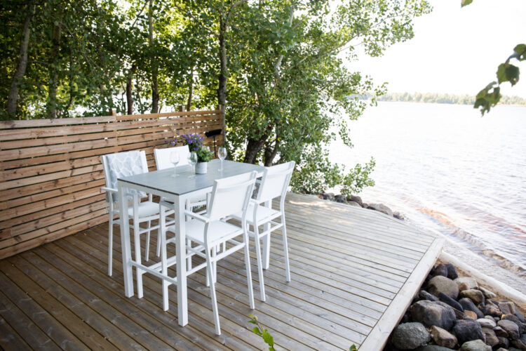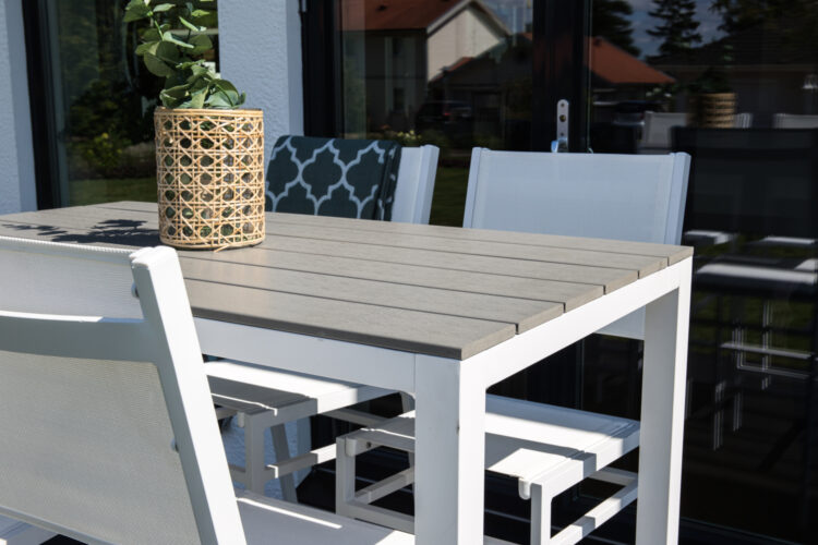 Materialet är framtaget för att användas utomhus då det är väderbeständigt och står emot både fukt och mögel. Aintwood är därför ett optimalt material för utomhusmöbler. Undvik skador på bordet genom att använda underlägg och låta bli att placera varma föremål direkt på ytan.