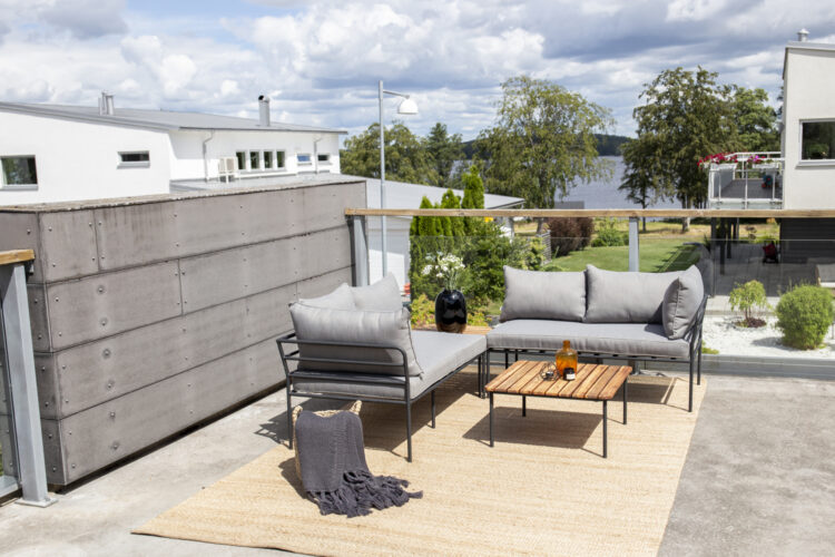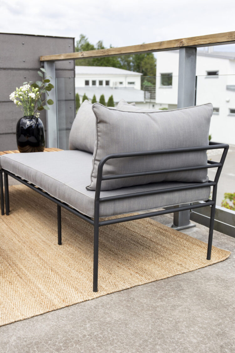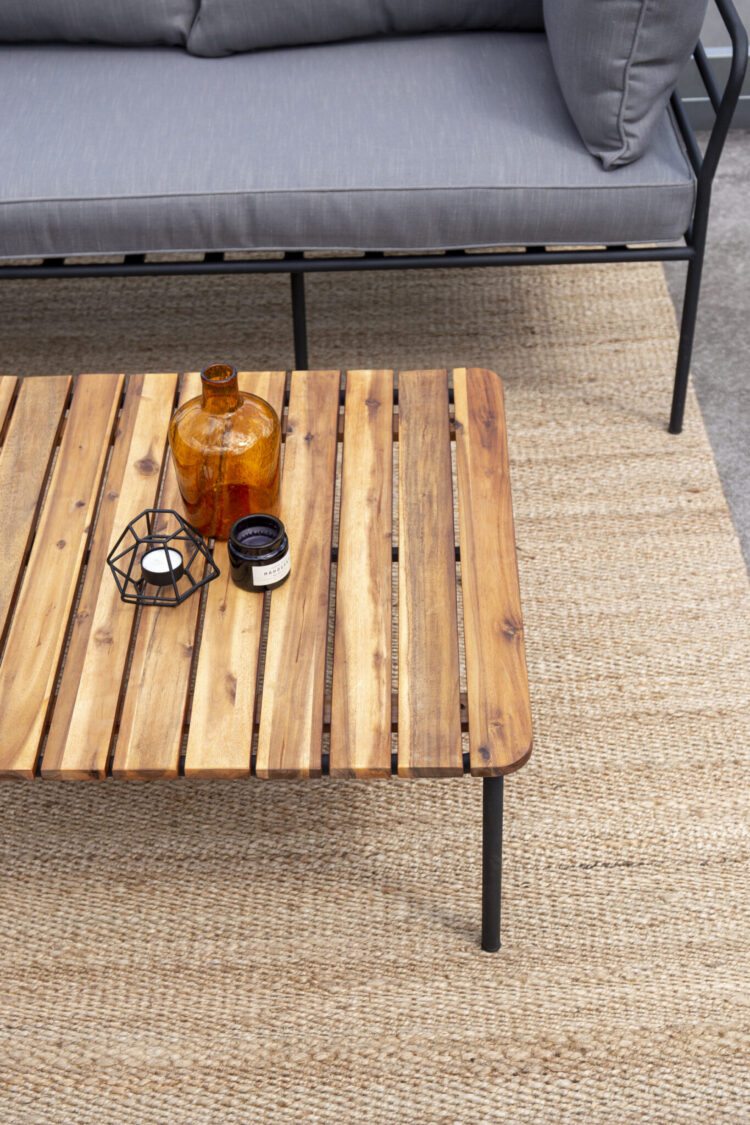 Stilren nätt soffgrupp perfekt till terassen. Soffgruppen består av en hörnsoffa med fyra sittplatser och ett hörn samt ett nätt soffbord. Tillverkad i svart pulverlackerad rör metall inklusive mjuka ljusgrå dynor. Stilrent soffbord med tunna svarta pulverlakerade rörben som ger bordet ett nätt, stilrent intryck samt bordsskiva i acacia med rundade hörn.