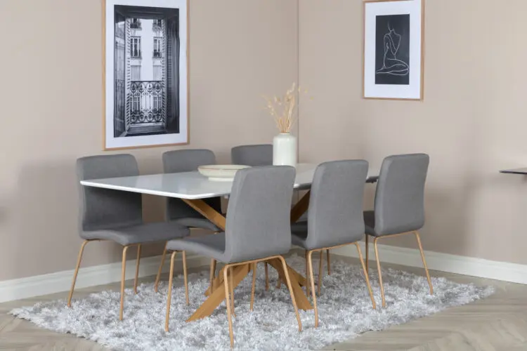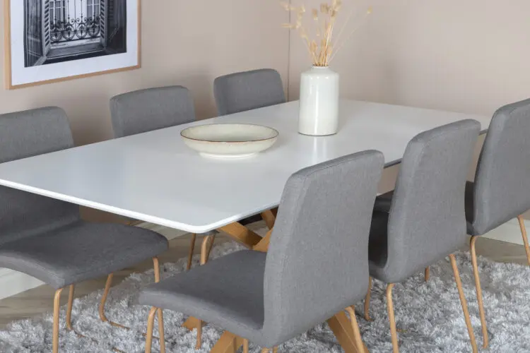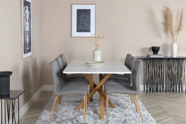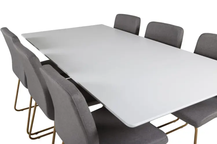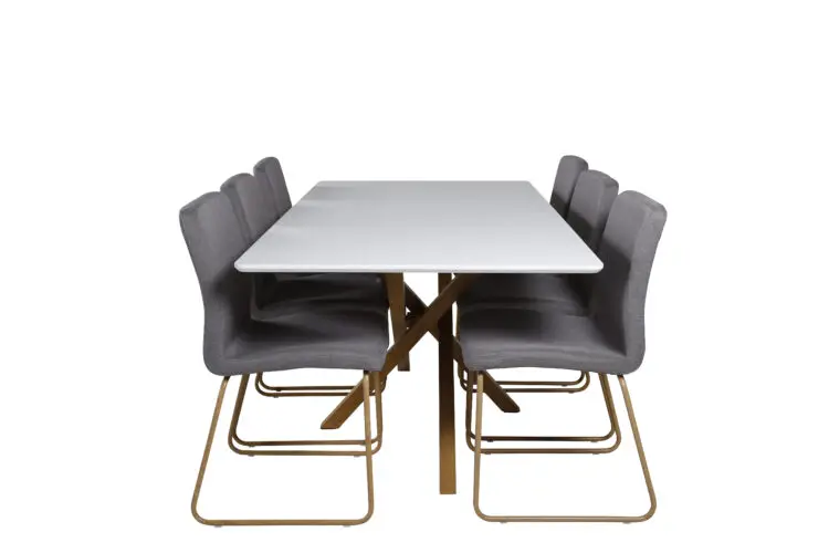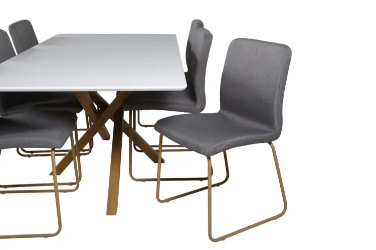 Piazza, vårt omtyckta rektangulära matbord med lyxig känsla och trendiga detaljer i designen. Bordsskivan av MDF har en vit kulör som skapar ett härligt lyster i rummet. Stommen har en läcker look med kryssben i naturfärgat metall som skapar ett stadigt blickfång. Ett designbord som sticker ut i varje rum och kommer garanterat locka dina gästers blickar. Skapa en härlig mittpunkt för dig och din familj att samlas runt!
