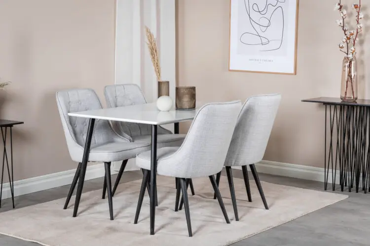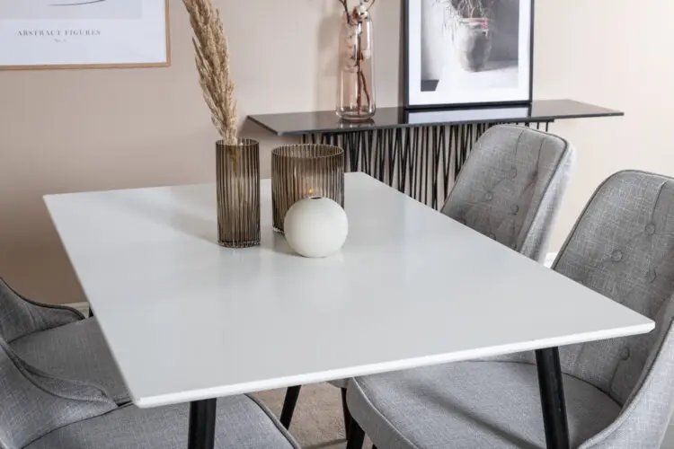 Klassiskt rektangulärt matbord i serien Polar i stilren vit kulör. Bordsskivan i MDF och bordsben i metall ger dig ett hållbart matbord i enkla former. Designen har influenser från Skandinavien och står sig över tid. De nätt utböjda benen ger ett modernt intryck. Möblera vardagsrummet ljust och fräscht med ett enkelt, luftigt matbord där familjen kan samlas för trivsamma måltider!