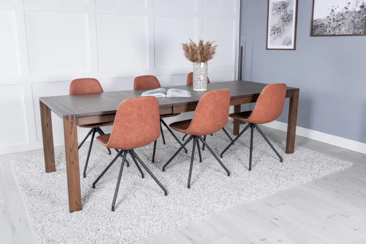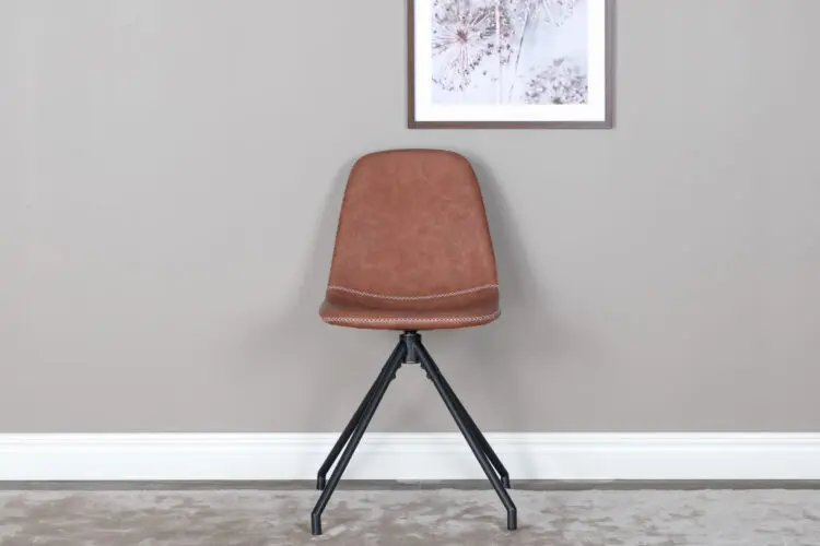 Inred hemmets hjärta i modern stil! Polar är en matstol med helklädd design och praktisk snurrfunktion. Stomme och ben i svart pulverlackerad metall samt och en lätt rundad rygg och sits i stoppad brunt konstläder med vit dekorsöm. Den är lika bekväm som iögonfallande! Lättare montering krävs.