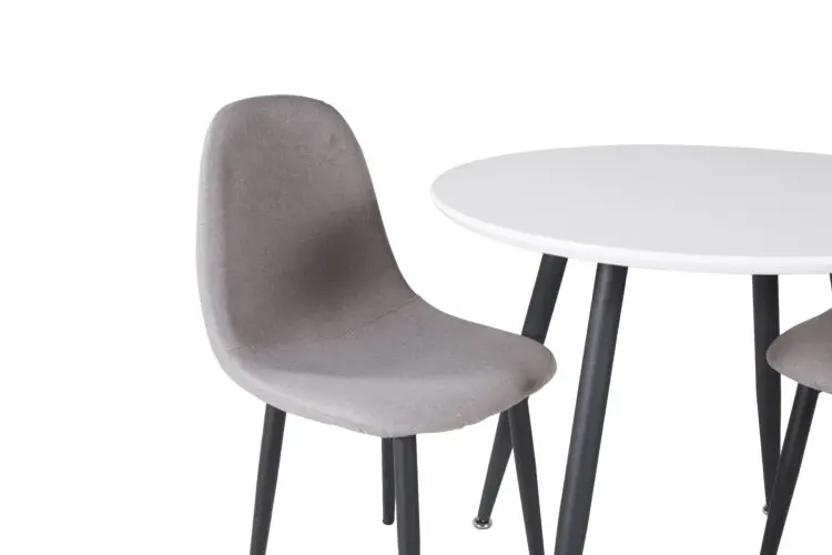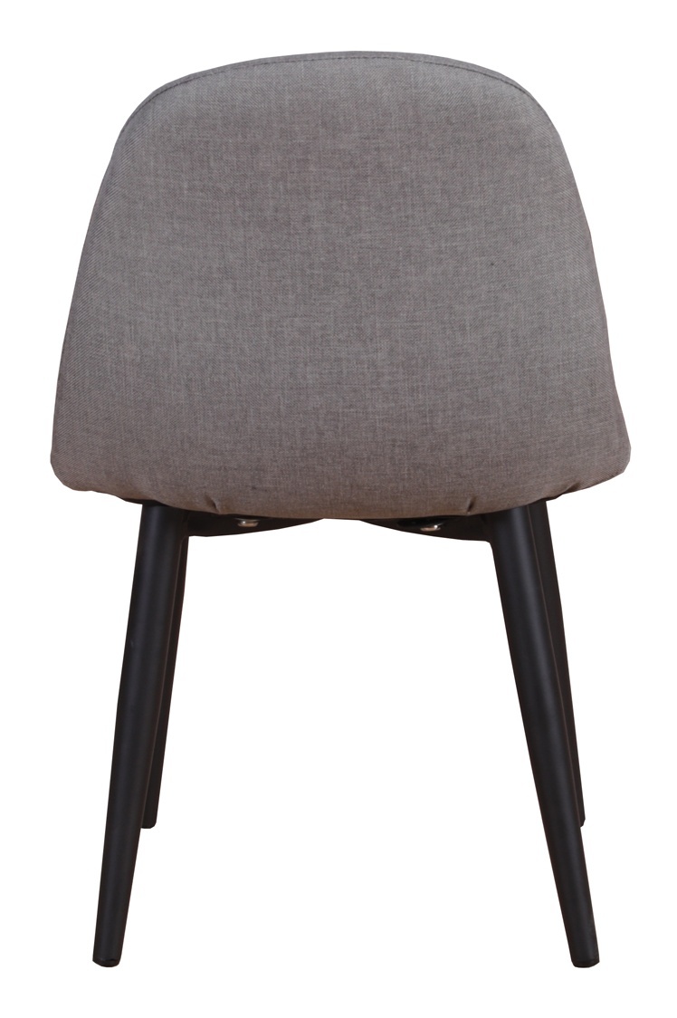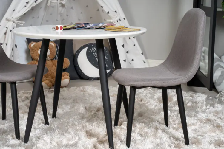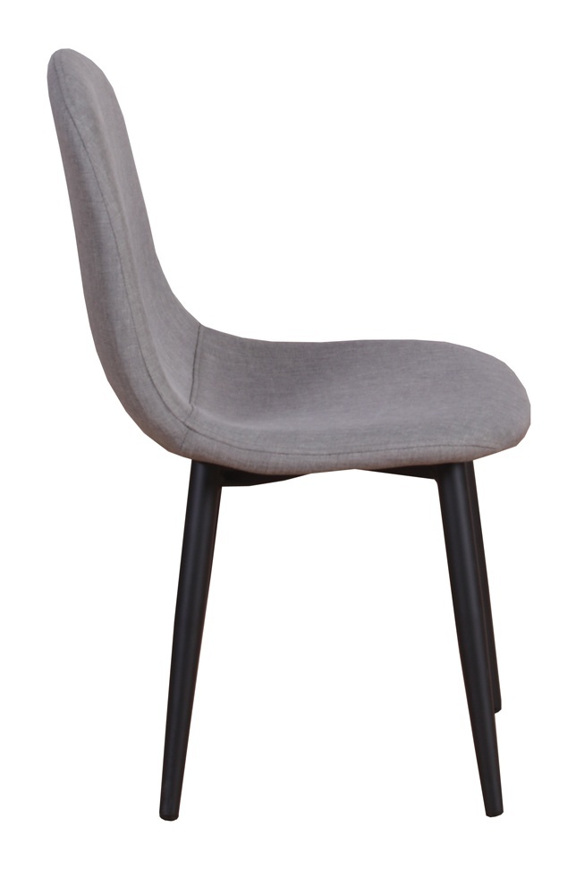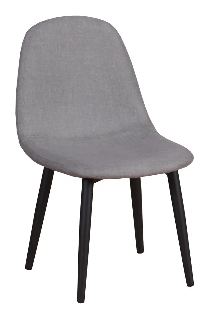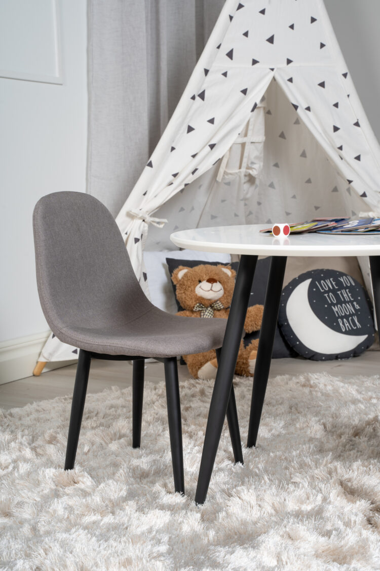 Matstol för barn i en helklädd design med ben i svart pulverlackerad metall samt med en lätt rundad rygg och sits i grått sammetstyg. Lättare montering krävs.