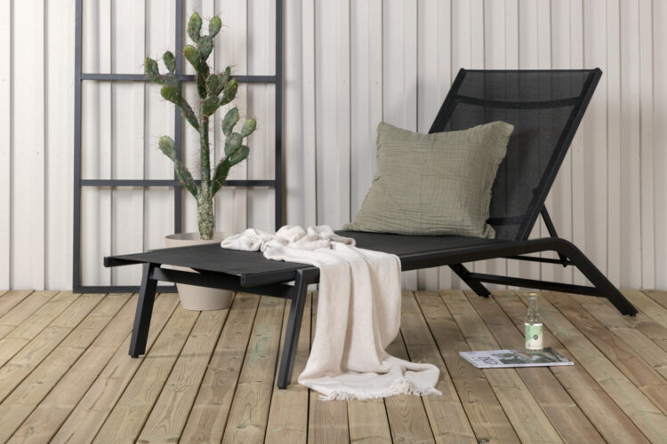 En perfekt solsäng att njuta av solen i, läsa en bok eller lyssna på en podcast. Sängen är gjord i svartlackerad aluminium och textilene med ett ryggstöd du själva justerar för att passa dig bäst.