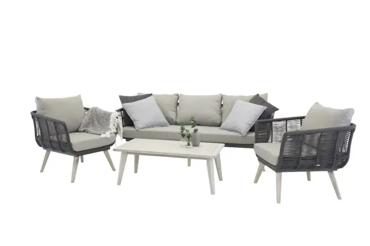 Skapa ett inbjudande blickfång med en charmig soffgrupp från serien Rives! Soffgruppen har en modern, stilren design som kommer passa perfekt till din uteplats i sommar. Den består av en hörnsoffa med rygg i svart rep och ben i antikvit akacia inklusive tjocka mjuka ljusgrå dynor. I soffgruppen ingår också ett lågt soffbord i matchande, antikvit akacia som skapar en snygg helhet! Välkomnas hem till en mysig soffgrupp och låt tiden här bli sommarens höjdpunkter!