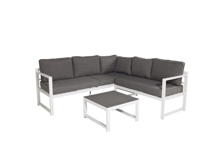 Modern stilren soffgrupp med en hörnsoffa till uteplatsen eller altanen. Tillverkad i vit pulverlackerad metall stomme med integrerade armstöd. Inklusive mjuka grå dynor och ett lågt soffbord i glas med ett granitutförande. Lättare montering krävs.