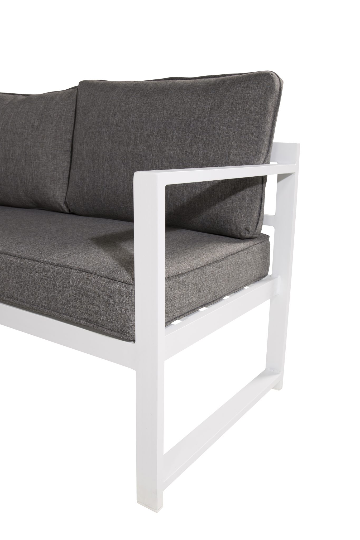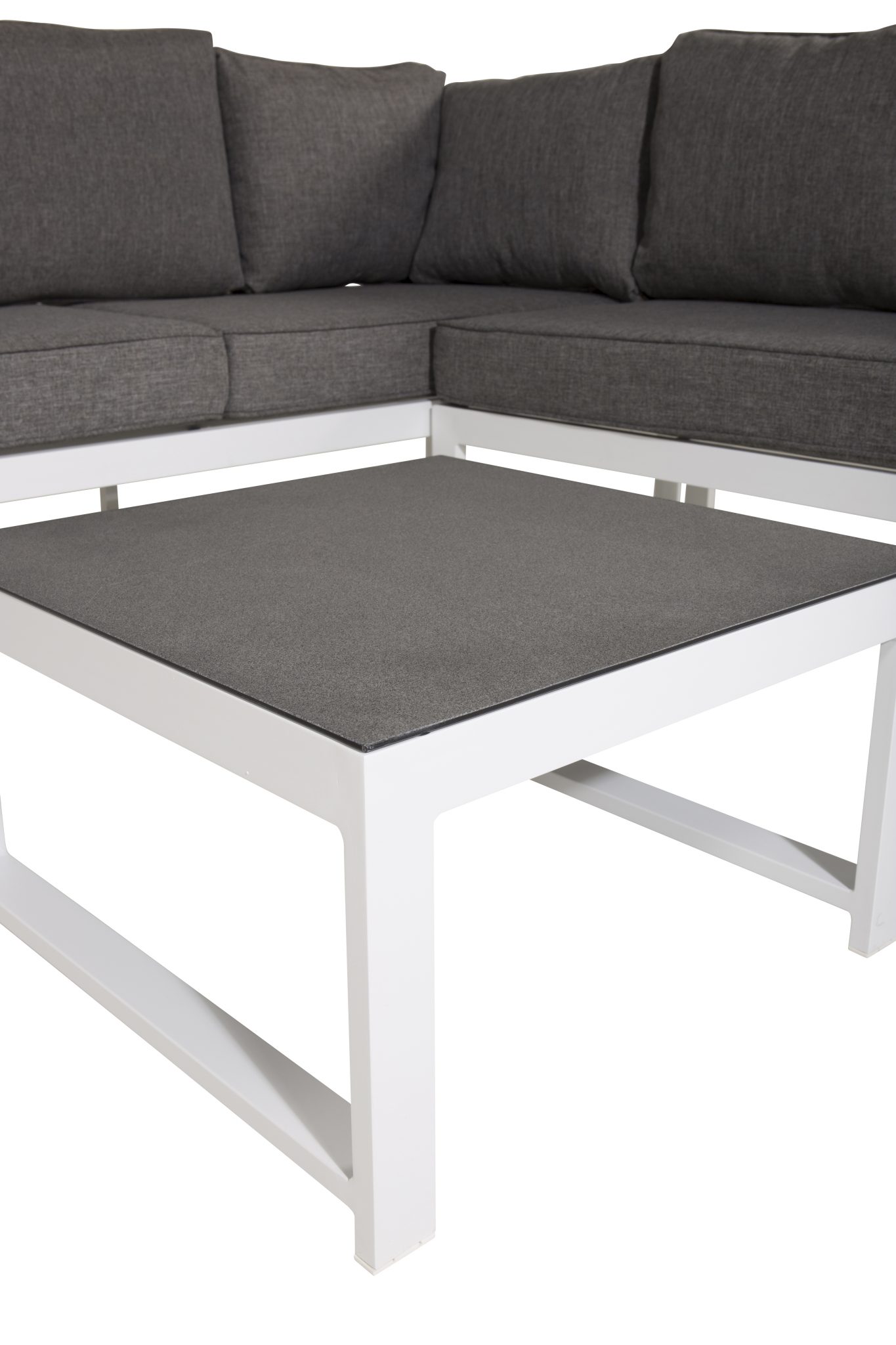 Modern stilren soffgrupp med en hörnsoffa till uteplatsen eller altanen. Tillverkad i vit pulverlackerad metall stomme med integrerade armstöd. Inklusive mjuka grå dynor och ett lågt soffbord i glas med ett granitutförande. Lättare montering krävs.