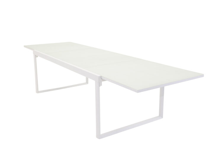 Santorini – Lika stilrent som praktiskt! Bordet är förlängningsbart och passar lika bra till vardags som till fest. Bordsskivan är i glas och underredet i aluminium: den genomgående vita kulören skapar en ombonad och fräsch känsla till möblemanget. Bjud in nära och kära till somriga måltider och slipp oroa dig över att alla ska få plats!