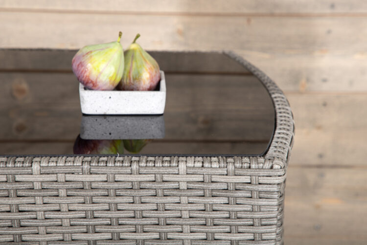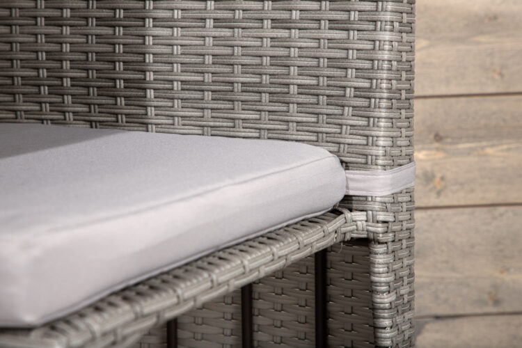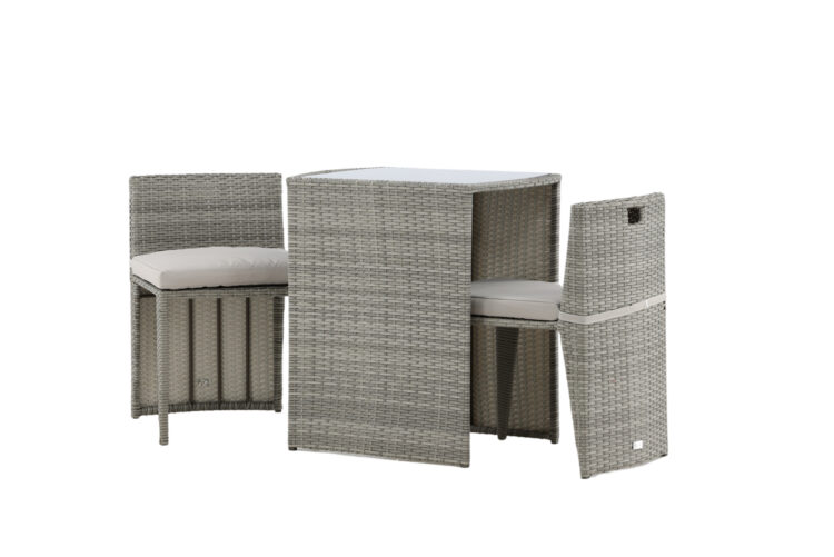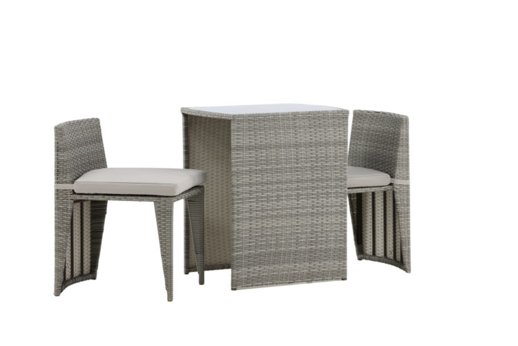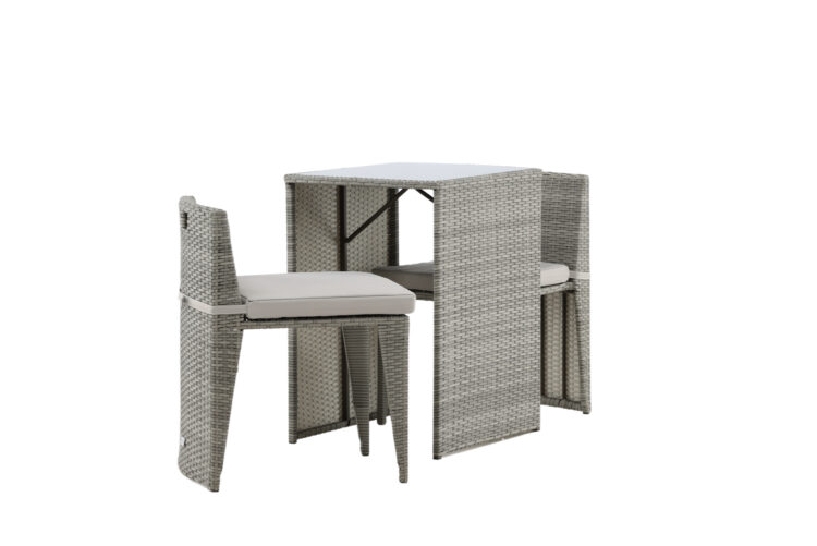 Mysigt grått caféset i en nätt design tillverkat i tåligt konstrotting som passar perfekt till den mindre uteplatsen. Cafésetet består av två stolar och ett bord med tillhörande glasskiva som står pall för både väder och vind, de nätta stolarna kommer med mjuka sittdynor och du kan enkelt skjuta in stolarna under bordet för enkel förvaring och platsbesparing.