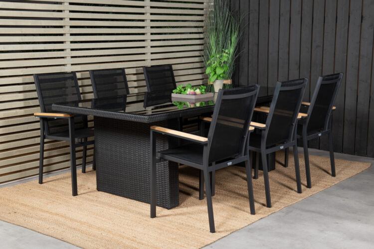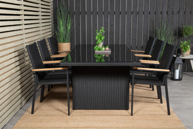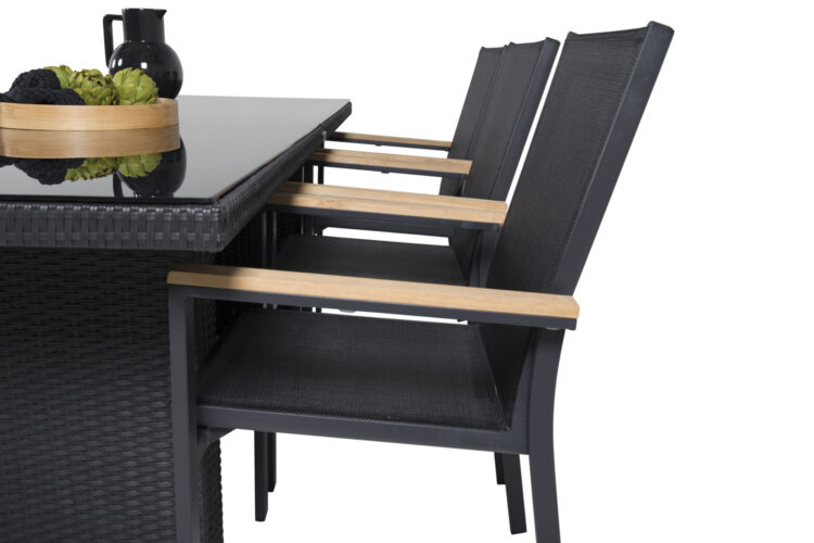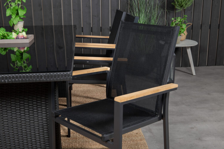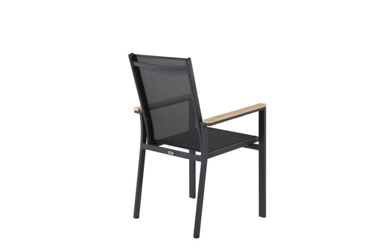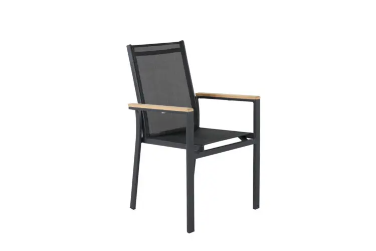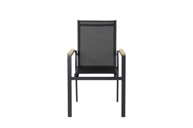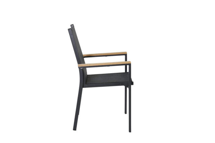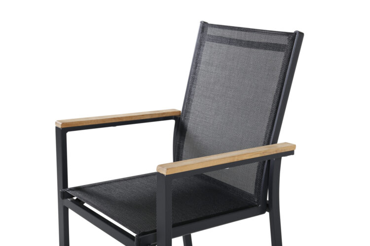 Texas, vår läckra matstol i skandinavisk design! De raka nordiska formerna ger dig en stilren stol som passar till alla tillfälle! Tillverkad i svart aluminium med en sits i textilene. Armstöden är dekorativa i teak vilket skapar en smakfull detalj. Stolen är stapelbar, för smidig förvaring. En slitstark stol som garanterat kommer göra succé på altanen i sommar!
