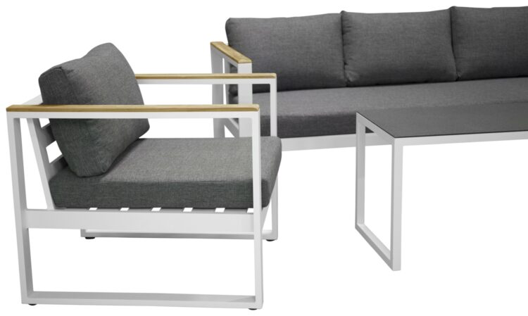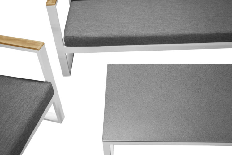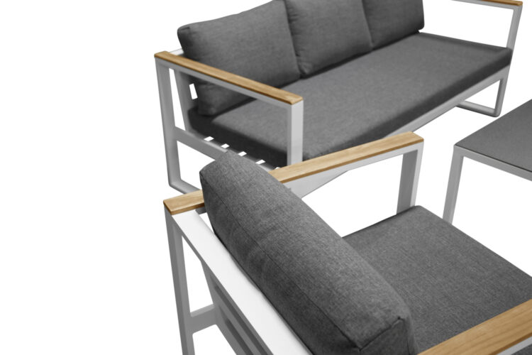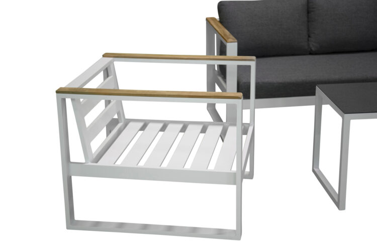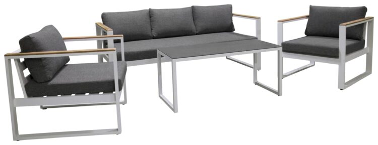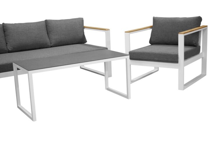 Modern stilren soffgrupp som passar perfekt på din uteplats. Soffgruppen består av en tresits soffa, två karmfåtöljer inklusive mörgrå dynor samt ett lågt soffbord med en bordsskiva i sprayfärgat glas. Tillverkat i vit pulverlackerad metall med stilrena detaljer i teak.