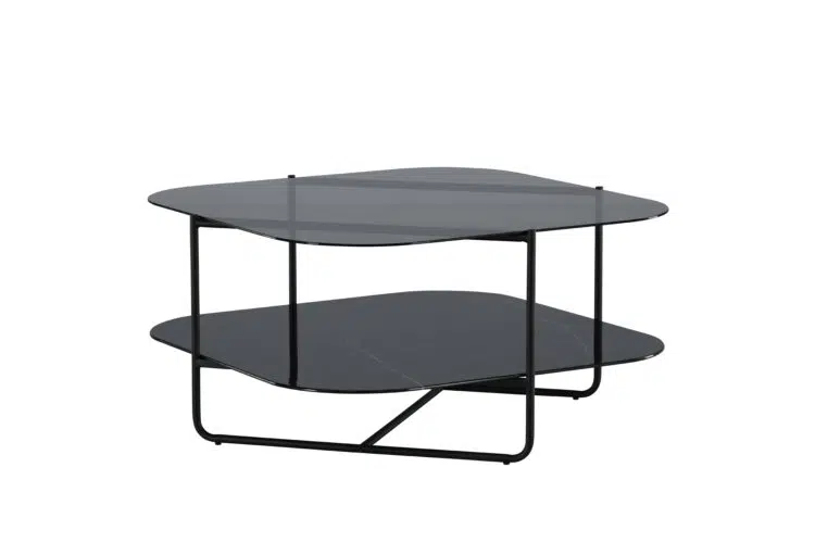 Skapa en stilmedveten atmosfär i vardagsrummet med det här iögonfallande soffbordet från serien Un-Line! Bordets design andas modernitet med sin tunna utformning och smala stomme i svart metall bidrar till en luftig och minimalistisk look. Toppskivan är i rökigt svart glas och synliggör hyllplanets vackra stenskiva i svart marmorglas – lika snyggt som praktiskt. Un-Line blir en stilikon framför soffan och kommer garanetrat höja inredningsnivån i ditt hem. Bordets mått: 85x85x45 cm.