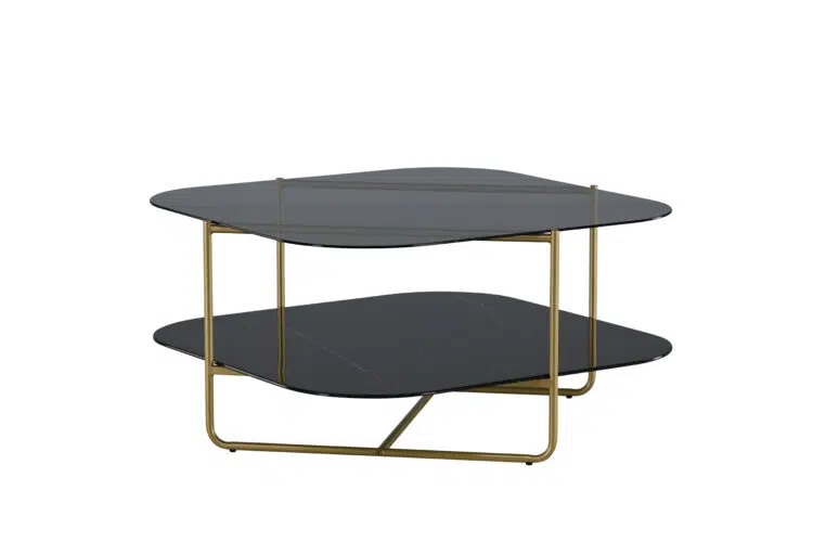 Skapa en stilmedveten atmosfär i vardagsrummet med det här iögonfallande soffbordet från serien Un-Line! Bordets design andas modernitet med sin tunna utformning och smala stomme i mässingsfärgad metall som bidrar till en luftig och lyxig look. Toppskivan är i rökigt svart glas och synliggör hyllplanets vackra stenskiva i svart marmorglas – lika snyggt som praktiskt. Un-Line blir en stilikon framför soffan och kommer garanetrat höja inredningsnivån i ditt hem. Bordets mått: 85x85x45 cm.