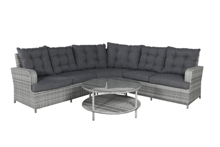 Exklusivt loungeset för sköna stunder på din uteplats. Soffgruppen består av en hörnsoffa med 5 sittplatser och en rundad hörndel. Inklusive mörkgrå mjuka dynor samt ett lägre runt soffbord med en avlastningshylla och en bordsskiva av glas. Tillverkat av en metallstomme och ljusgrå konstrotting.