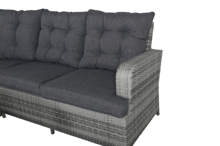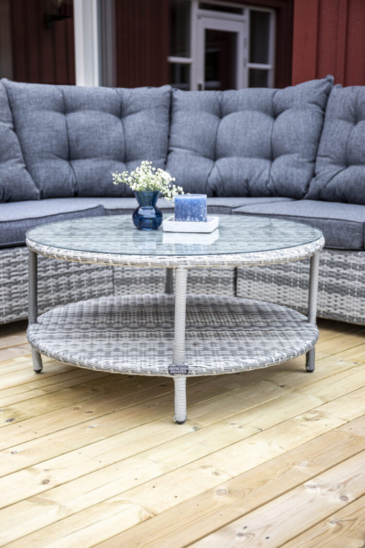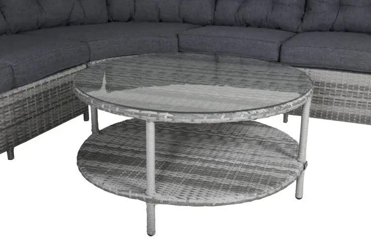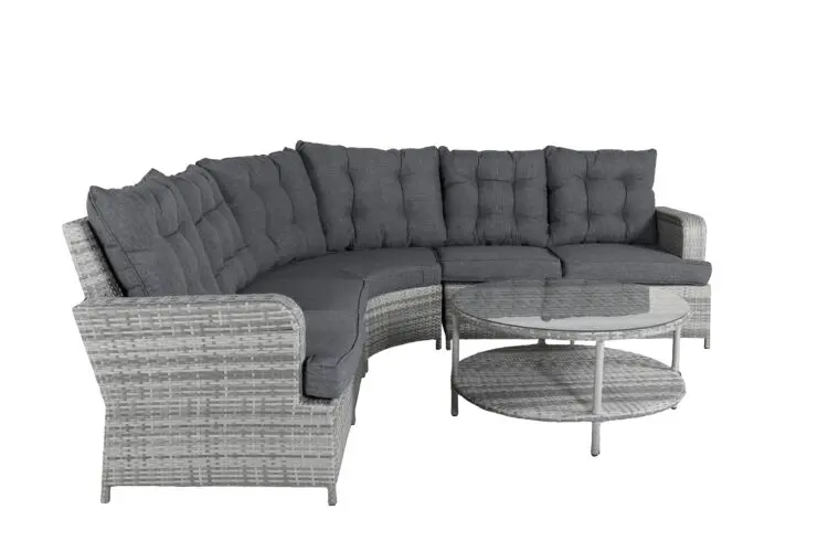 Exklusivt loungeset för sköna stunder på din uteplats. Soffgruppen består av en hörnsoffa med 5 sittplatser och en rundad hörndel. Inklusive mörkgrå mjuka dynor samt ett lägre runt soffbord med en avlastningshylla och en bordsskiva av glas. Tillverkat av en metallstomme och ljusgrå konstrotting.