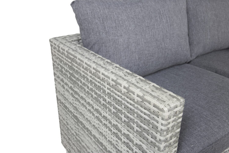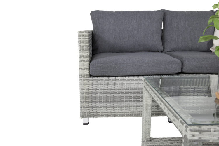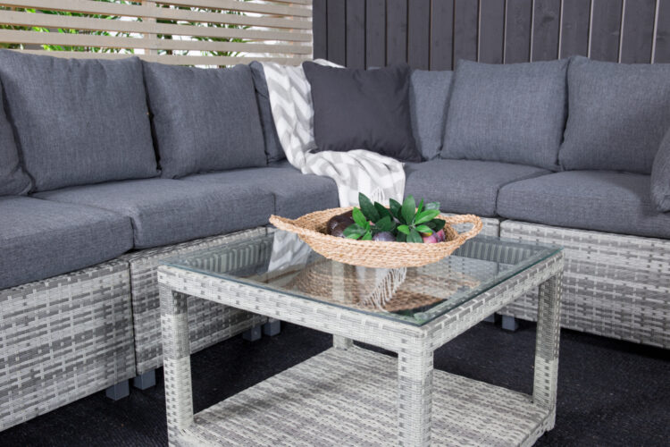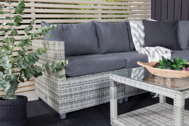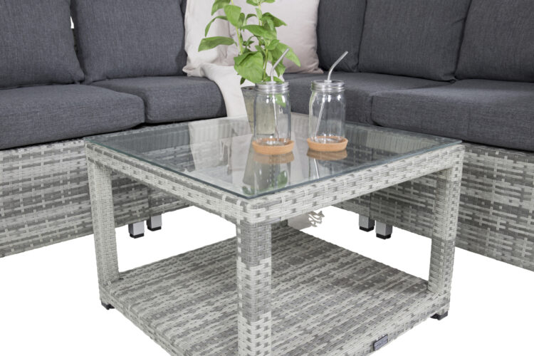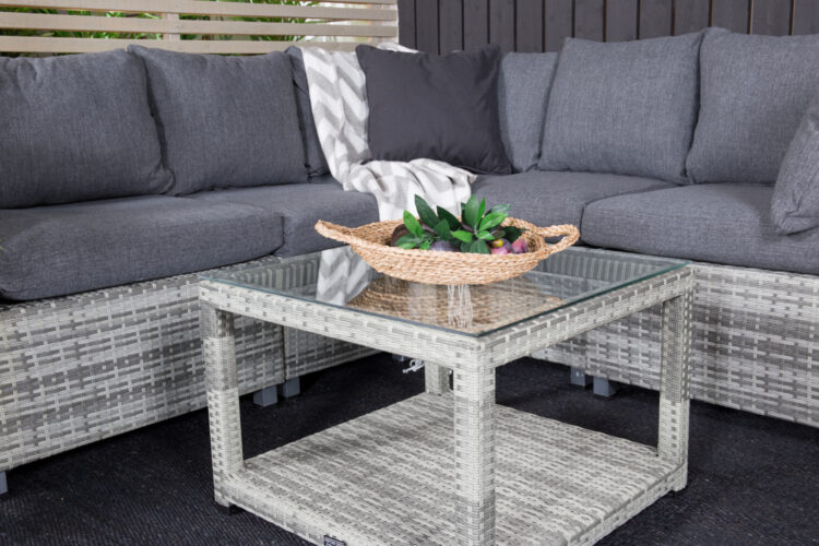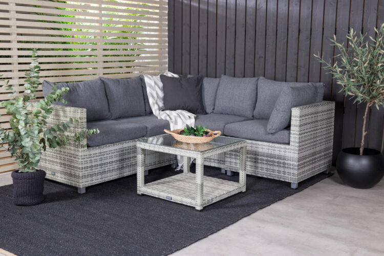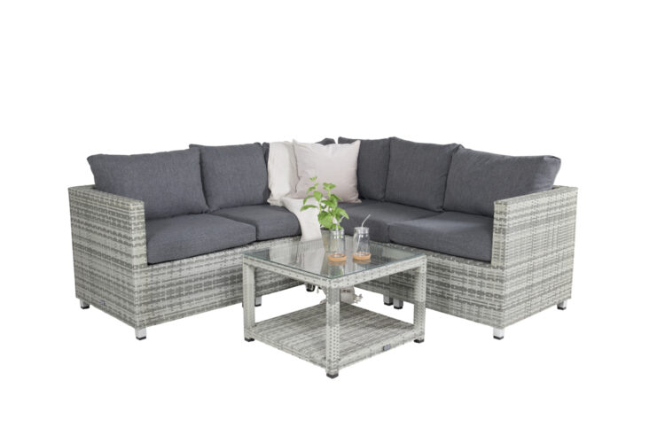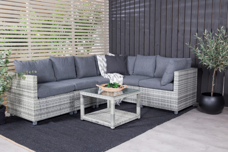 Soffgrupp i modern design till din uteplats eller altan. Soffgruppen består av en hörnsoffa i modulform med fyra sittplatser och en hörndel som går lätt att bygga ihop för att passa dina behov. Inklusive mörkgrå mjuka dynor samt ett lägre soffbord med en avlastningshylla och en bordsskiva av glas. Tillverkat av en metallstomme och ljusgrå konstrotting. Moduler finns att köpa till.