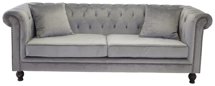 Låt ditt hem inredas av ett hantverk med tradition! Den klassiska Chesterfield-soffan har ett hantverk som ärvts ner från generation till generation. Velvet är en stilsäker soffserie i Chesterfield design med läckert sammetstyg och dekorativa djuphäftade knappar. Den här rymliga och bekväma 3-sits soffan med rak design och tidlös grå sammet inger en konstnärlig och vacker känsla till ditt hem. Soffbenen i rustikt trä bidrar till soffans eleganta utformning och moderna look.