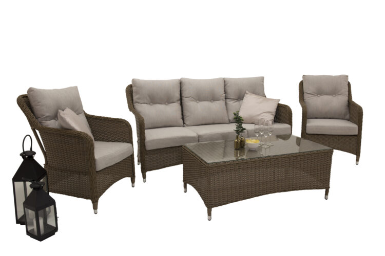 Exklusiv soffgrupp med en kombination av tidlös design och en god komfort – perfekt till din uteplats i sommar! Soffgruppen från serien Vikelund består av en tresitssoffa, två karmfåtöljer inklusive mjuka, tjocka sandfärgade pickerade dynor samt ett lägre, matchande soffbord med en bordsskiva i stilrent glas. Tillverkat i naturfärgad konstrotting med en aluminiumstomme – lika praktiskt som modernt!