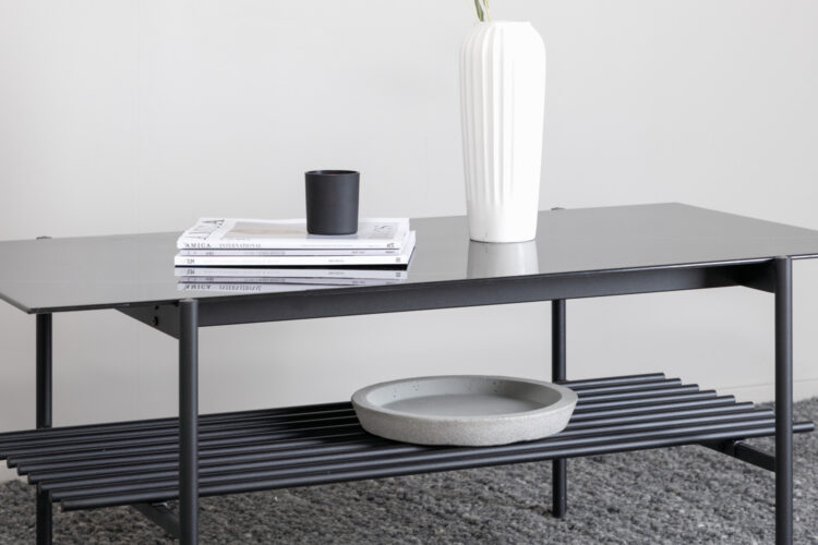 Von Staf rektangulära soffbord imponerar med sin moderna utformning och industriella design som garanetrat kommer dra blickarna till sig och skapa en stilmedveten atmosfär i vardagsrummet! Den genomgående svarta kulören smälter enkelt in i de flesta inredningsstilar och är lika tidlös som praktisk. Toppskivan är tunn i elegant marmorglas och den dekorativa stommen är av svart metall. Det finns även ett smart hyllplan i ribbad design som möjliggör extra förvaringsyta. Bordets mått: 60x120x48 cm.