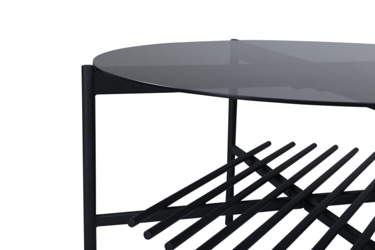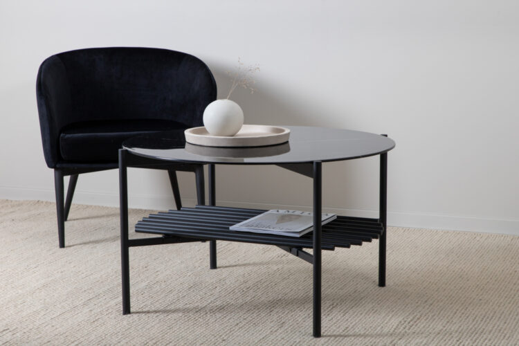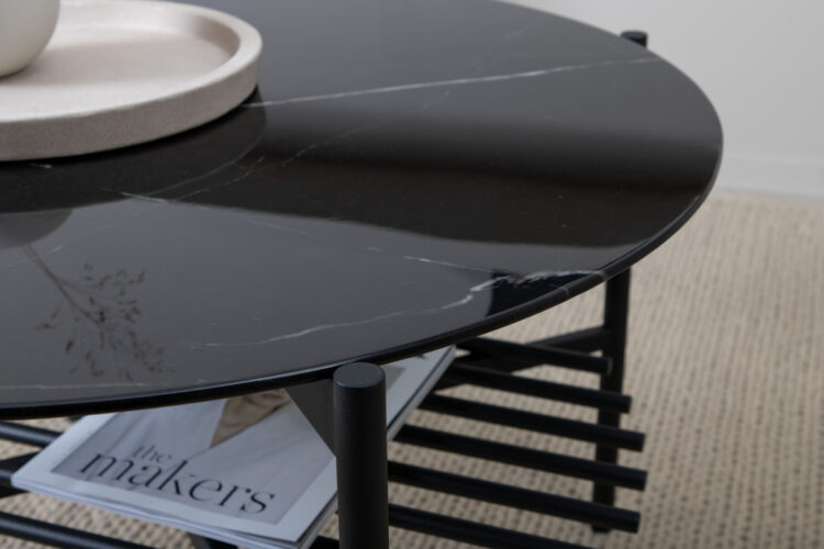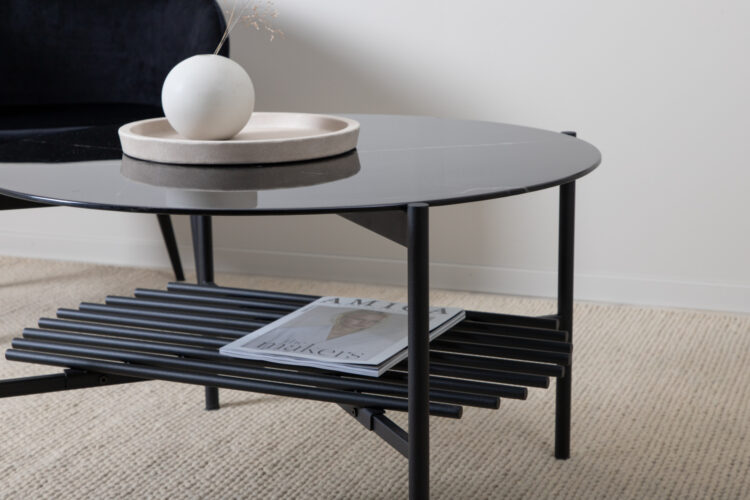Von Staf runda soffbord imponerar med sin moderna utformning och industriella design som garanetrat kommer dra blickarna till sig och skapa en stilmedveten atmosfär i vardagsrummet! Den genomgående svarta kulören smälter enkelt in i de flesta inredningsstilar och är lika tidlös som praktisk. Toppskivan är tunn i elegant marmorglas och den dekorativa stommen är av svart metall. Det finns även ett smart hyllplan i ribbad design som möjliggör extra förvaringsyta. Bordets mått: diameter: 80cm, höjd: 48 cm.