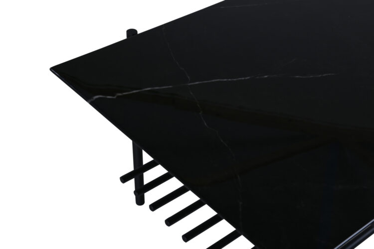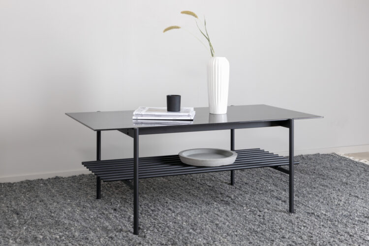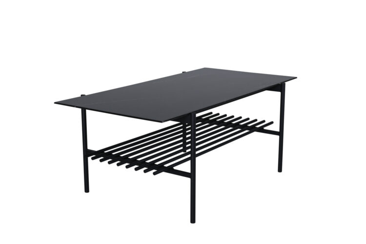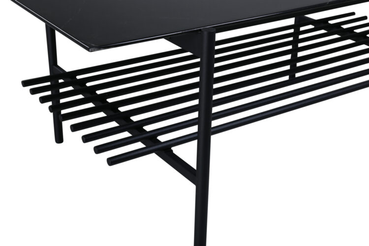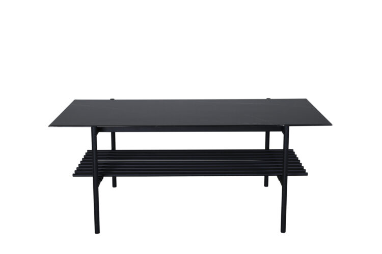 Von Staf rektangulära soffbord imponerar med sin moderna utformning och industriella design som garanetrat kommer dra blickarna till sig och skapa en stilmedveten atmosfär i vardagsrummet! Den genomgående svarta kulören smälter enkelt in i de flesta inredningsstilar och är lika tidlös som praktisk. Toppskivan är tunn i elegant marmorglas och den dekorativa stommen är av svart metall. Det finns även ett smart hyllplan i ribbad design som möjliggör extra förvaringsyta. Bordets mått: 60x120x48 cm.