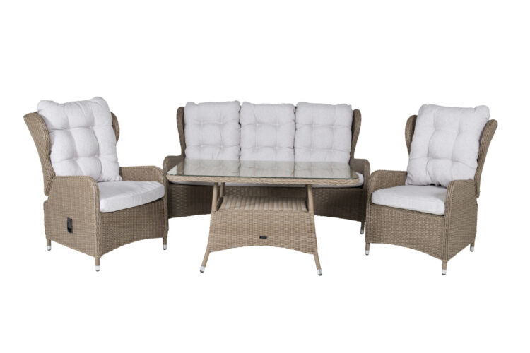 Exklusivt loungeset med en kombination av tidlös design och en fantastisk komfort till din uteplats eller altan. Soffgruppen består av en tresits soffa, två reclinerfåtöljer samt ett högre soffbord med en avlastningshylla och en bordsskiva av glas. Tillverkat i naturfärgad konstrotting med en aluminiumstomme. Inklusive mjuka, tjocka beige pickerade dynor.
