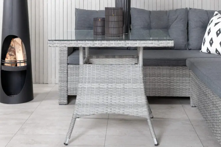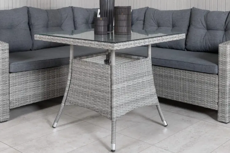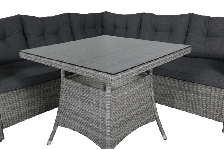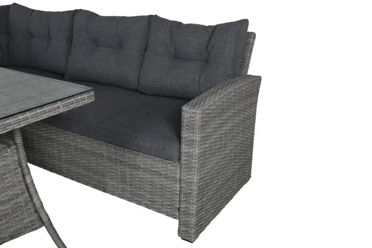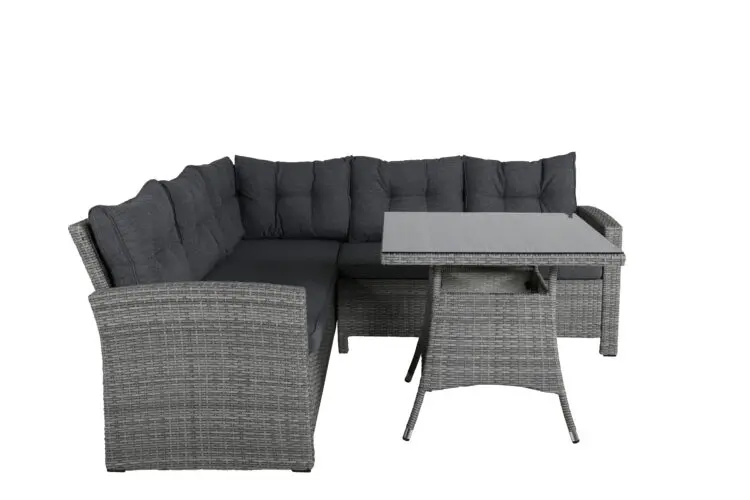 Soffgrupp till din uteplats eller altan skapad med fokus på komfort. Soffgruppen består av en hörnsoffa i ljusgrå konstrotting med 5 sittplatser och en hörndel inklusive ljusgrå pickerade dynor samt ett högre bord i konstrotting med en avlastningshylla och en bordsskiva i glas.