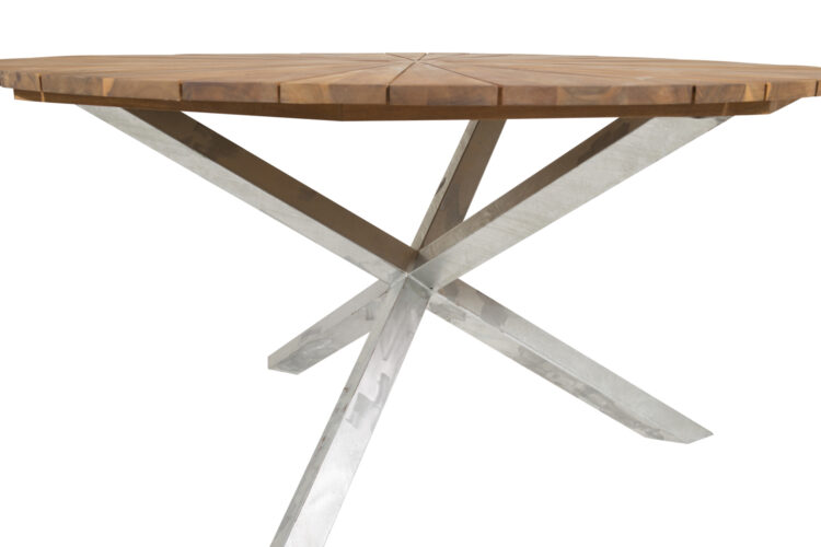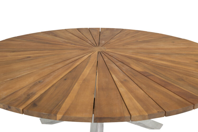 Vårt runda matbord Zenia har en modern industriell design med en bordsskiva i brun acacia och en stomme i silvrigt stål. Dess praktiska och slitstarka material gör att bordet lämpar sig lika bra i uterummet som i trädgården. Följ våra skötselråd för bästa hållbarhet och njut av sommaren i trivsamt sällskap runt ett läckert matbord där ingen hamnar på kanten.